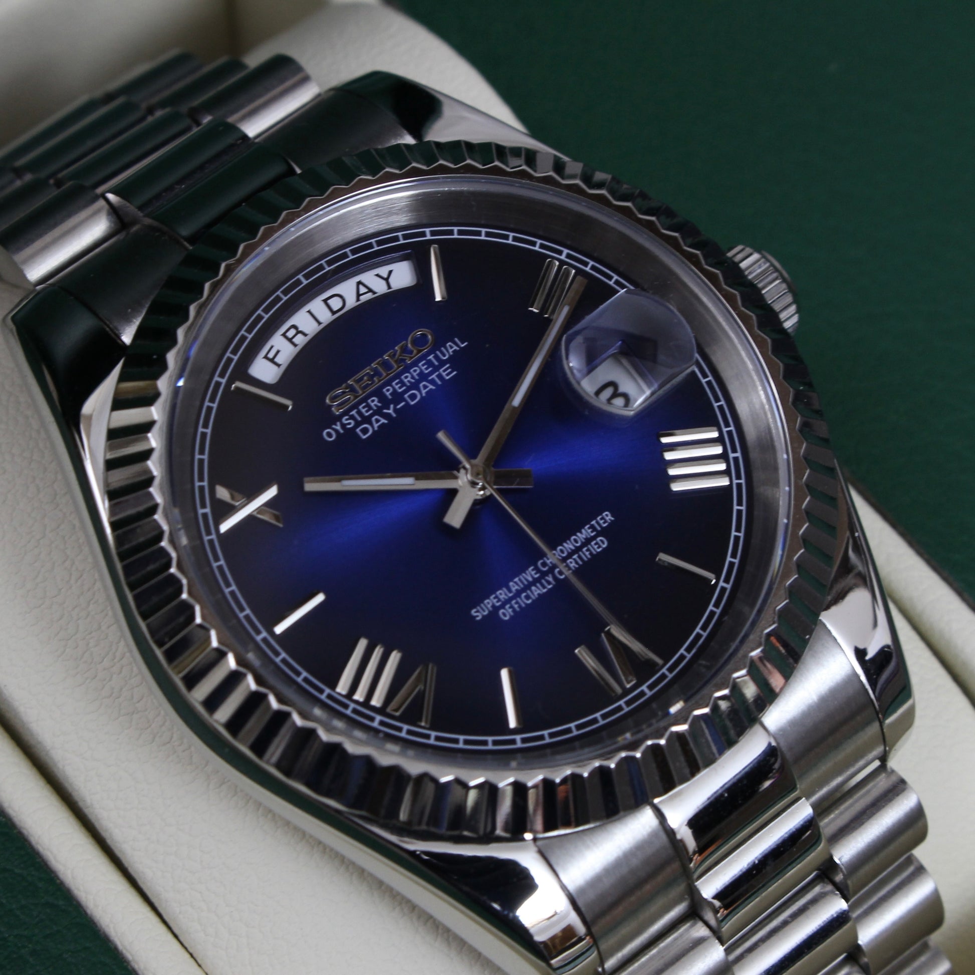 Inspired by the iconic Daydate design, and featuring the prestigious Miyota 8285 automatic movement, we present the Seiko Mod Daydate. A 39 mm high-end quality watch combining the perfect alliance between excellence and accessibility.