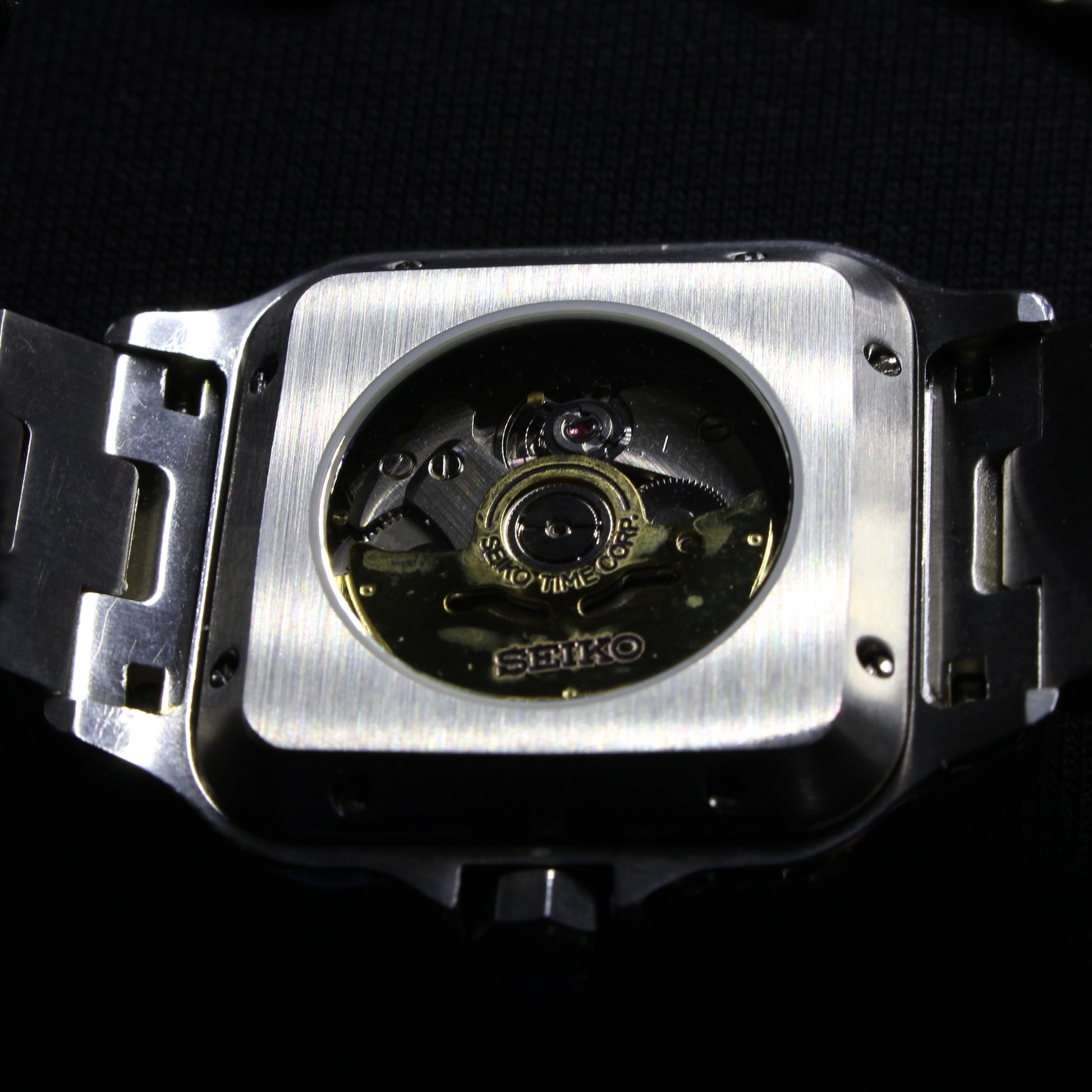 Inspired by the iconic Santos design, and featuring the prestigious Seiko NH35 automatic movement, we present the Seiko Mod Santos. A 38 mm high-end quality watch combining the perfect alliance between excellence and accessibility.